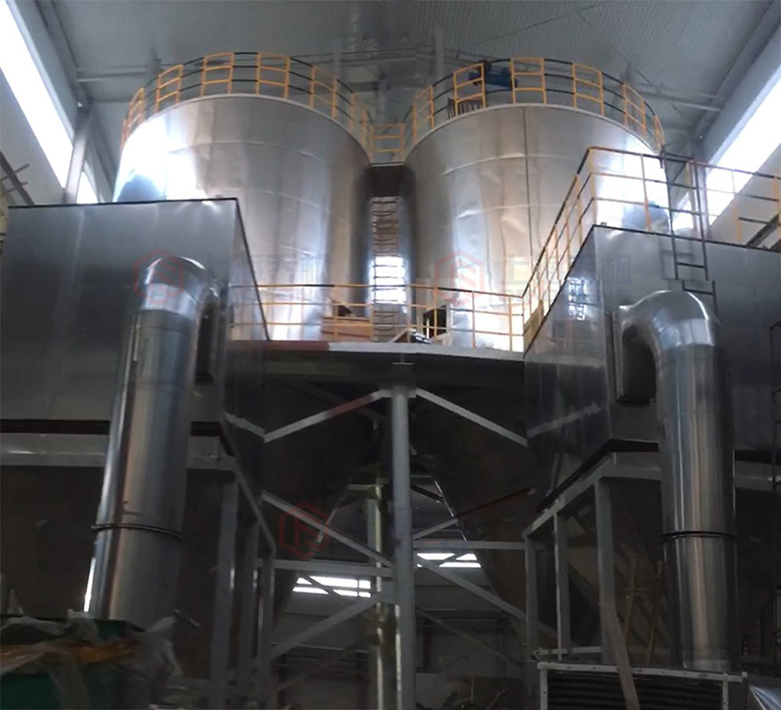 空氣經過濾和加熱,進入干燥器頂部空氣分配器,熱空氣呈螺旋狀均勻地進入干燥室。料液經塔體頂部的高速離心霧化器,噴霧成極細微的霧狀液珠,與熱空氣并流接觸在極短的時間內可干燥為成品。成品連續地由干燥塔底部和旋風分離器中輸出,廢氣由風機排空。